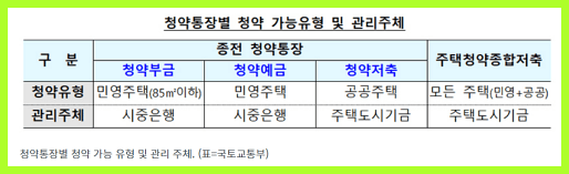 통장 유형에 따라 민영.공공주택 하나만 청약이 가능했던 종전의 청약예금과 부금, 청약저툭통장 등 입주자저축을 모든 주택 유형에 청약할 수 있는 주택 청약종합저축통장으로 전환을 허용합니다.