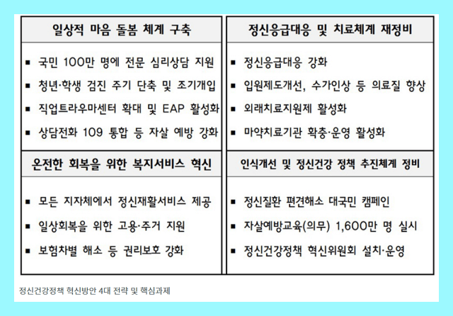 보건복지부의 보도자료에 따르면, 7월부터 '전 국민 마음투자 사업'을 본격시행하기로 하였습니다. 또한 9우러부터 누구나 SNS로 자가진단이 가능합니다. 또한 내년부터 청년 정신건강검진도 확대하기로 하였습니다. 아는 <정신건강정책 혁신방안의 세부이행계획>을 보도하는 자리에서 이 같은 내용의 운영방안과 정신건강 인색개선 캠페인 방안등을 논의했습니다. 정신건강은 행복한 삶을 위해서 꼭 필요합니다. 사회가 경쟁심화적이고, 빠른 것만 추구하다 보면 일상에 지쳐 마음이 우울하기 쉬워집니다. 때로는 관습적으로 돌아가는 일상을 멈춰 서서 세상의 아름다움을 바라보는 것도 하나의 방법입니다. 모든 사람들이 행복한 삶을 가꾸어 가기를 바라봅니다.