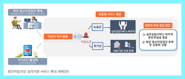 내년부터 청년 대상 정신건강검진을 확대하고, 학생 마음건강검사도구도 본격적으로 적용합니다.
